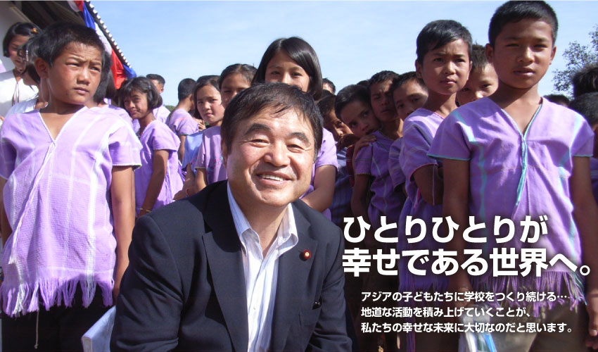 教育の遅れているアジアの子供たちに学校を建設し、その国の教育の振興とともに、両国の友好親善を図るために国会議員のボランティアグループ「アジアの子どもたちへ学校をつくる議員の会」を結成。1997年に、私が若手の議員仲間を誘って結成し、それぞれのポケットマネーを毎月1万円ずつ積み立てながら、これまでにカンボジア、ラオス、ミャンマー、タイなどに小学校を贈呈してきました。 我が国が、第二次大戦後の混乱から今日の世界有数の経済大国になれたのは教育制度が確立し、すべての国民が等しく教育を受けていることによってなしえたものと考えています。そうした経験から、教育の機会に恵まれない子供たちに私たちが具体的に教育の場を協力することが、その地域との絆を深め、また、その国との友好親善を発展させる大きな第一歩だと考えました。 これからも、学校建設を続けながら「ともだち小学校」の生徒たちを日本に招待し、日本の子供たちとともに「ともだちサミット」を開催しようと思っています。いずれ、その子供たちの中から国を代表するリーダーが誕生し、日本との友好や親善がますます進んでいくものと期待しています。 アジア全体の教育の振興を図ると共に、地道な活動を積み上げていくことが、私たちの幸せな未来に大切なのだと思います。